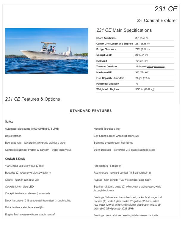 Fully equipped with the outstanding performance of the inshore version of the SeaV²® hull, the all-new 231 Coastal Explorer offers superb sportscar-like handling, rough water capabilities, and the nimble ability to fish in some of the skinniest water. Built with quality and craftsmanship for true owner satisfaction, the 231 CE is perfect for those looking for an inshore boat in the 23-ft. class.
